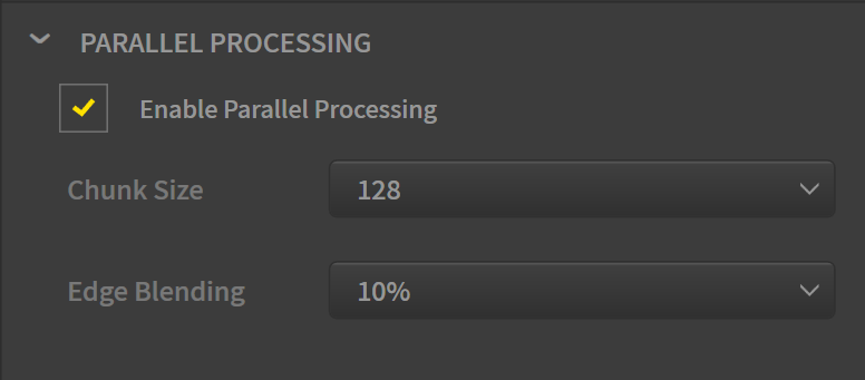 このバージョンでは、すべてのマルチコアノードが、チャンクの分散方法を制御するオプションを提供します。 チャンクのサイズ、エッジブレンドの量を選択するか、マルチコア処理を完全にオフにすることができます。 後者のオプションでは、ノードの処理がかなり遅くなる場合がありますが、クリーンな結果が保証されます。