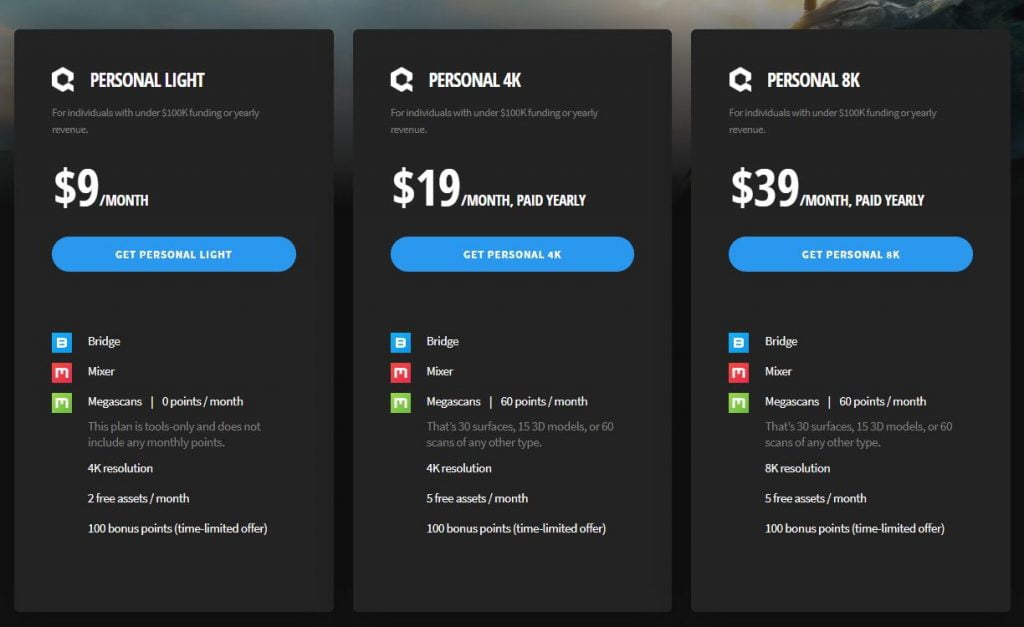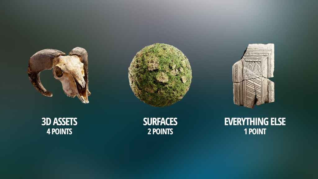 各アセットにかかるポイント数を削減し、構造全体を簡素化します。サーフェスのコストは2ポイントのみになり、3Dモデルのコストは4ポイント(以前はそれぞれ12ポイント)になりました。他のタイプのアセットは、デカール、アトラス、ディスプレイスメント、不完全性などを含むそれぞれ1ポイントです。パーソナルプランでは、30個のサーフェス、15個の3Dモデル、または60個のその他のタイプのアセットです。
