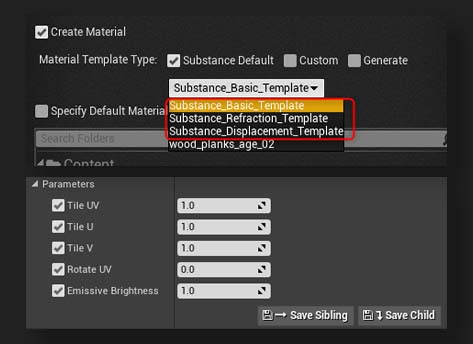 また、マルチプラットフォームのサポートが追加されたことに加え、マテリアルのインスタンス化も完全にサポートやSubstance エンジンでサポートされる数値出力を備えた新しいマテリアルテンプレートワークフローも導入されています。マテリアルテンプレートを使用すると、UE4でSubstanceマテリアルシェーダを設定する方法を正確に定義することができます。