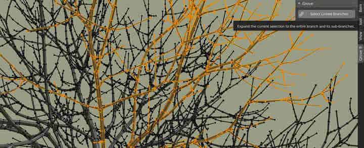 この新しいツールでは、編集モードで枝全体を選択することができます。完全に成長が終わった後に使用し、枝を削除したり、回転させたり、拡大縮小したり、木の周りを移動させたりと、メッシュに最終的な調整を加えることができます。これらはすべてBlenderのデフォルトのメッシュツールを使って行います。