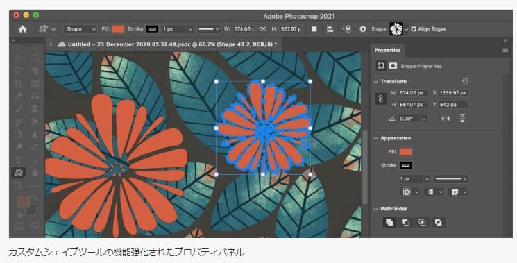 このリリースでは、カスタムシェイプツールを使用しながら、シェイプのプロパティパネルからカスタムシェイプの幅、高さ、角度、反転、リセットアピアランスなどのオプションを制御できます。また、カンバス上の変形コントロールを使用して、シェイプのプロパティを変更せずにカスタムシェイプを変形できるようになりました。