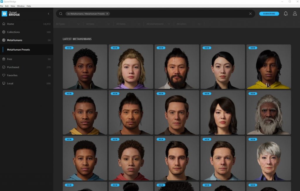 BridgeとMegascansサイトの両方で、左のナビゲーションパネルにあるMetaHumansタブからMetaHuman Presetsにアクセスでき、ダウンロードおよびエクスポートが可能です。