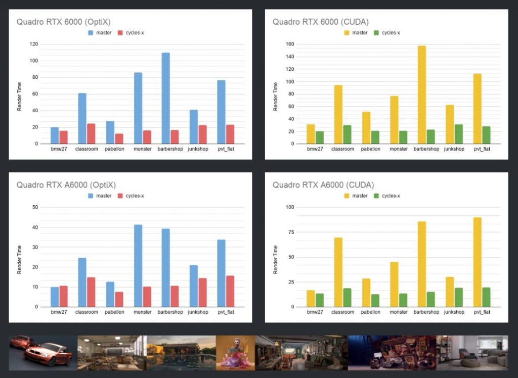 まず、よく知られたベンチマークシーンでのGPUレンダリングの結果です。使用されたシーンは、ボリュームレンダリングなど、まだ実装されていない機能は削除されています。