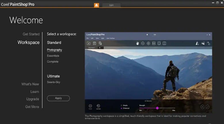 写真を撮るのが初めての方や、趣味で写真を撮る方のためにウェルカム画面が再設計されました。新しい「ワークスペース」タブには、製品を簡単に使いこなすためのチュートリアルや学習コンテンツが組み込まれています。また、最近使用したファイルのサムネイルプレビューが追加され、ナビゲーションプロセスがよりシームレスになりました。さらに、ドキュメントを考慮したスケーリング機能が強化され、大きな画像にドロップシャドウ、内側と外側のベベル、テクスチャーなどのクリエイティブな効果をより効果的に加えることができます。