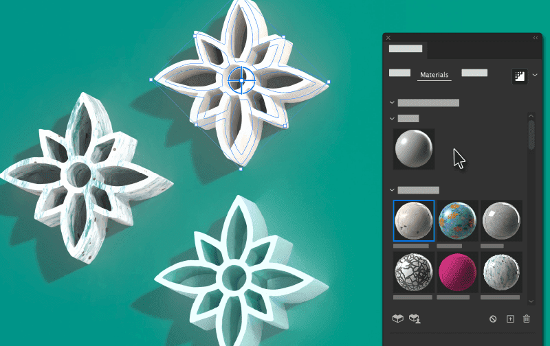 Substance マテリアルを使ってアートワークにテクスチャを追加し、リアルな 3D グラフィックスを作成できます。独自のマテリアルを追加することも、何千もの Adobe Substance マテリアルアセットから選ぶこともできます。