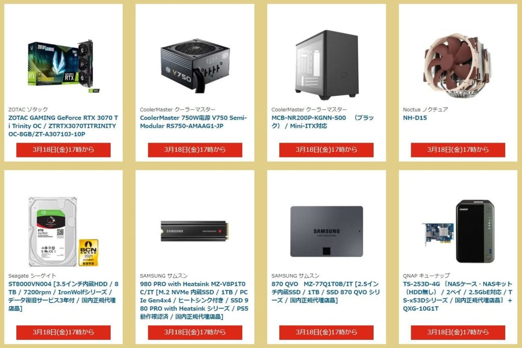 今回のセールでは、「ZOTAC GAMING GeForce RTX 3070 Ti Trinity OC 」「ST8000VN004 [3.5インチ内蔵HDD / 8TB」「FlexScan EV2456-RWT (ホワイト) 24.1インチ WUXGA(1920x1200) IPS 4辺フレームレスモニター」などのセールが予定されています。実際のセールではより多くの製品があり、人気なものはすぐに売り切れる場合がありますのでご注意ください。