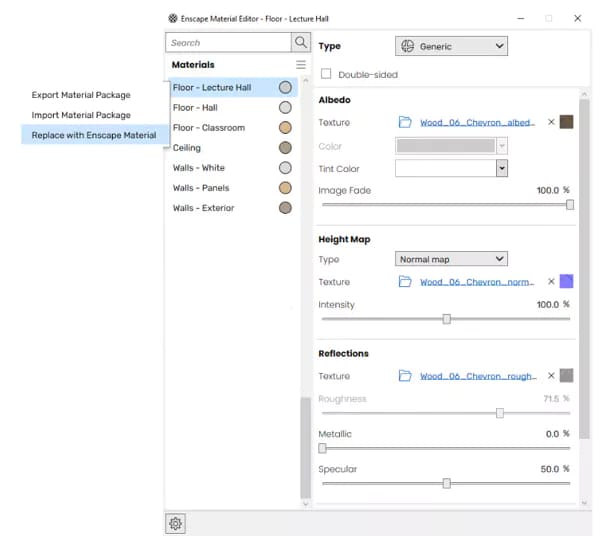 EnscapeのマテリアルをEnscapeマテリアルエディターで直接置き換えることができるようになりました。これにより、マテリアルのインポートやエクスポートを手動で行ったり、システム上にデータファイルを保存する手間を省くことができます。