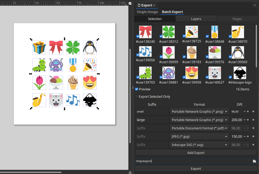 シンプルエクスポートでは、Inkscape SVG、SVG、最適化PNGからJPG、TIFF、PDFなど、保存可能なあらゆるフォーマットを選択できます。バッチエクスポートは、エクスポートしたいオブジェクト、解像度、名前、そして各選択肢のフォーマットを選択してエクスポート可能です。
