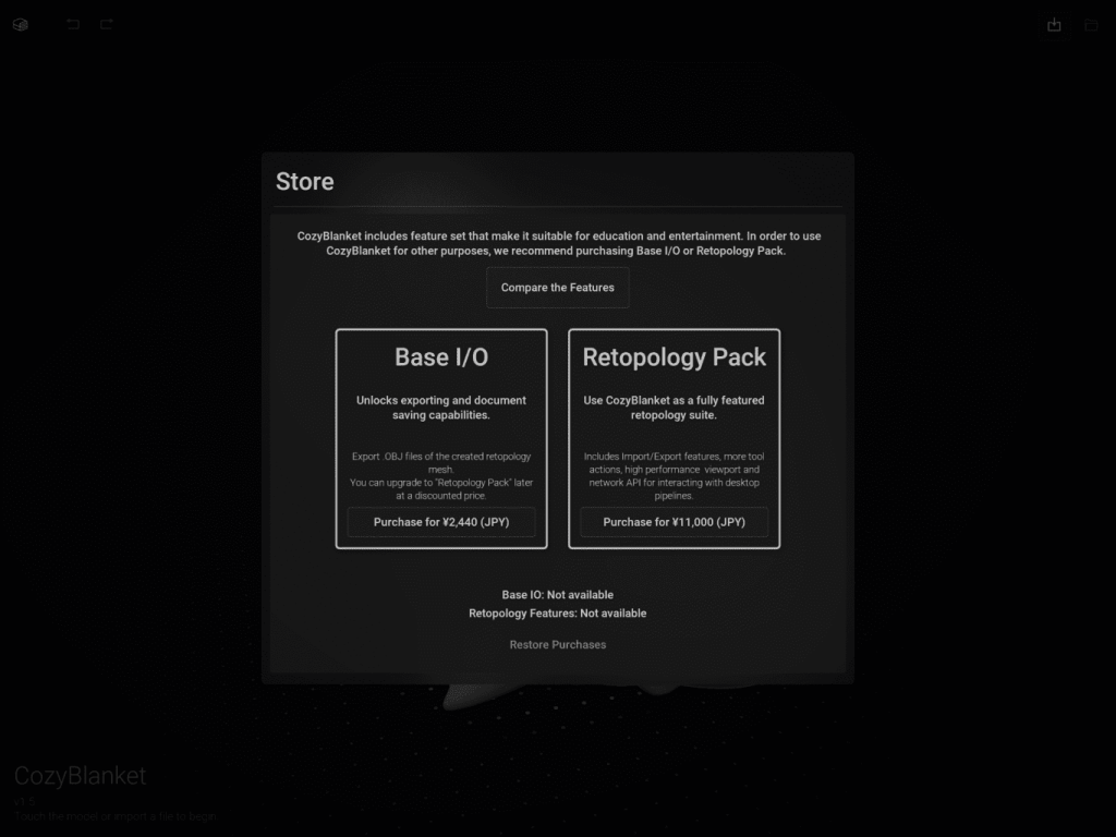 この新しいBase I/Oエディションでは、インポート/保存オプションのみをアンロックします。Retopology Pack で利用可能な他の機能は含まれていません。