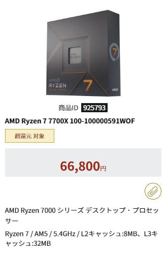 | AMD Ryzen 7 7700X | 8C/16T | 最大 5.4 / 4.5 GHz | 40MB | 第5世代 | 105W | $399 | |
