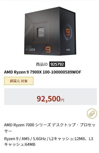 | AMD Ryzen 9 7900X | 12C/24T | 最大 5.6 / 4.7 GHz | 76MB | 第5世代 | 170W | $549 | |