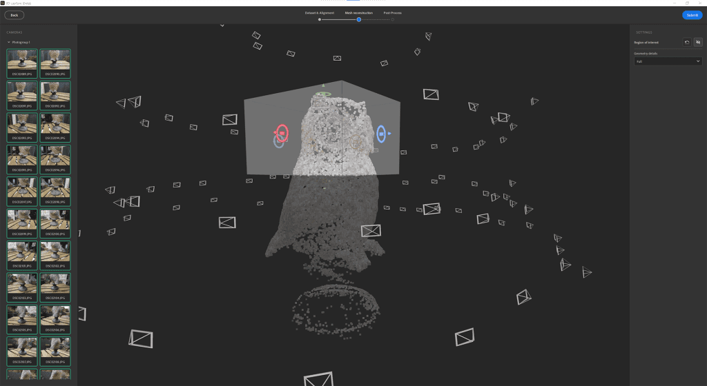 関心領域(Region of interest)を切り替えると、画像の位置合わせの後にバウンディングボックスが表示されます。再構成する正確な領域を設定し、位置調整することができます。