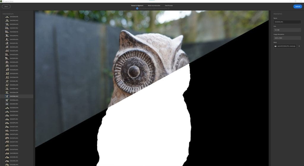 3Dキャプチャしたいオブジェクトの背景を削除することができます。マスクタブで画像をインポートした後、オブジェクトの自動生成されたマスクが作成されます。マスクの使用には多くの利点があり、特徴を検出し、マスクされていない領域のみを再構築することができます。