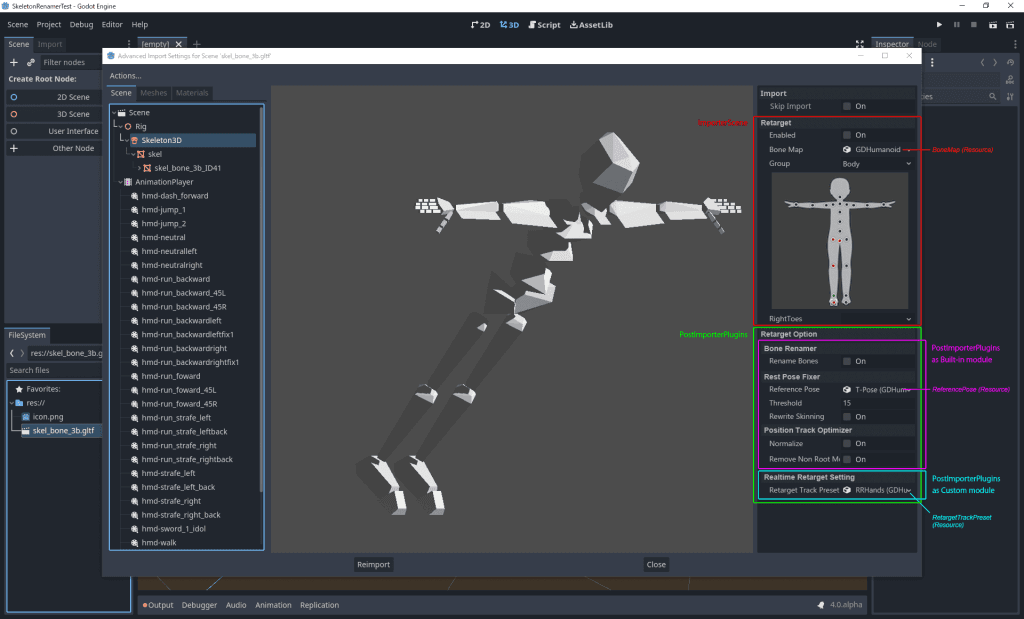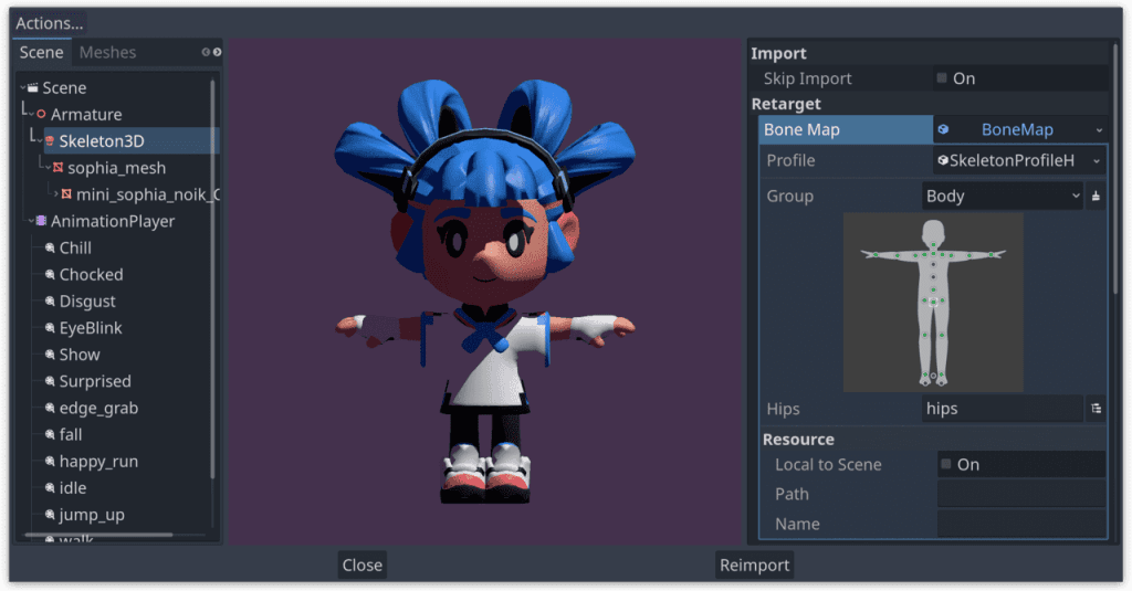 この機能を補完するために、 Tokage氏が提供する新しいアニメーションリターゲットシステム( animation retargeting system)では、インポート時にアニメーションを異なるアセットにマッピングすることができるようになりました。これにより、既存のアニメーションを、プロポーションの異なる他のモデルに適応させることが格段に容易になりました。その結果、モーションキャプチャデータやオンラインライブラリのリソースを活用し、時間を節約することができます。