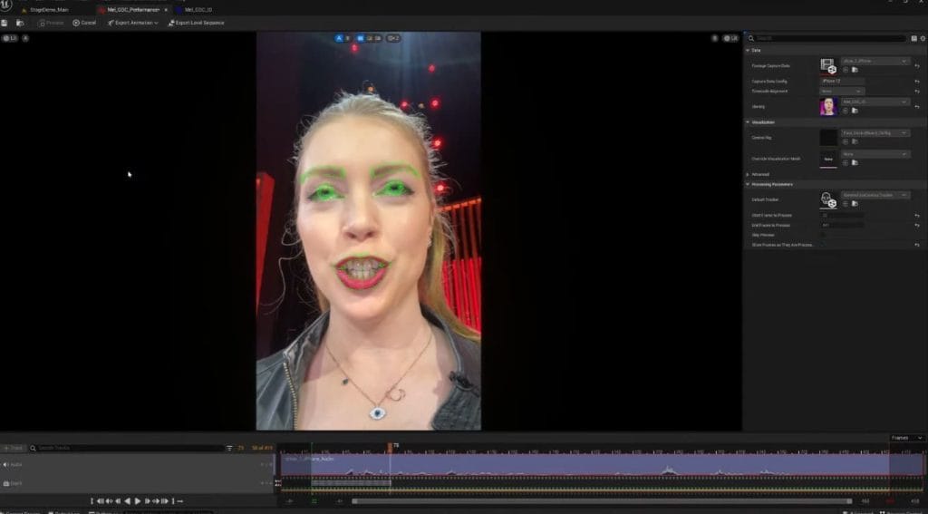 このステップを経て、MetaHuman Identityは、MetaHumanのフェイシャルリグの位置をトラッキングしながら、演技を解釈するために使用されます。その結果、アクターとMetaHumanの特徴の違いに関わらず、あらゆる微妙な表情がMetaHumanのターゲットキャラクターに正確に再現されることになります。Unreal Engineでは、パフォーマンス処理が可視化されて、アニメーション化されたMetaHuman Identityとアクターの映像を1フレームずつ比較することができます。