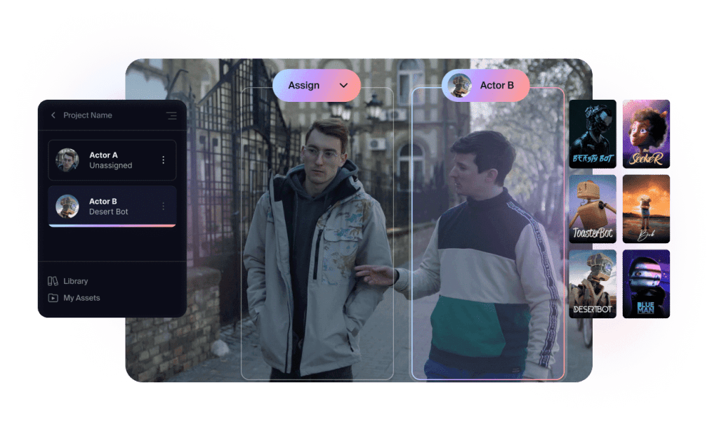 CGキャラクターを選択またはアップロードし、ワンショットまたはシーケンス全体に適用することができます。システムは、1台のカメラからの映像に基づいて自動的にカットを検出し、ビデオ全体を通してアクターの演技を追跡します。そして、その演技を、自動的にアニメーション、照明、合成されたお好みのCGキャラクターに転送します。
