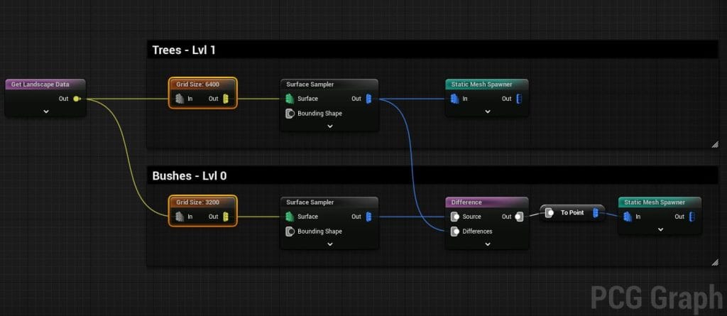階層生成では、同じPCGグラフ内で異なるグリッドサイズを実行できます。 階層的なロジックにより、特に実行時に大規模なワールドに対して、より最適なプロシージャル生成を実現することができます。