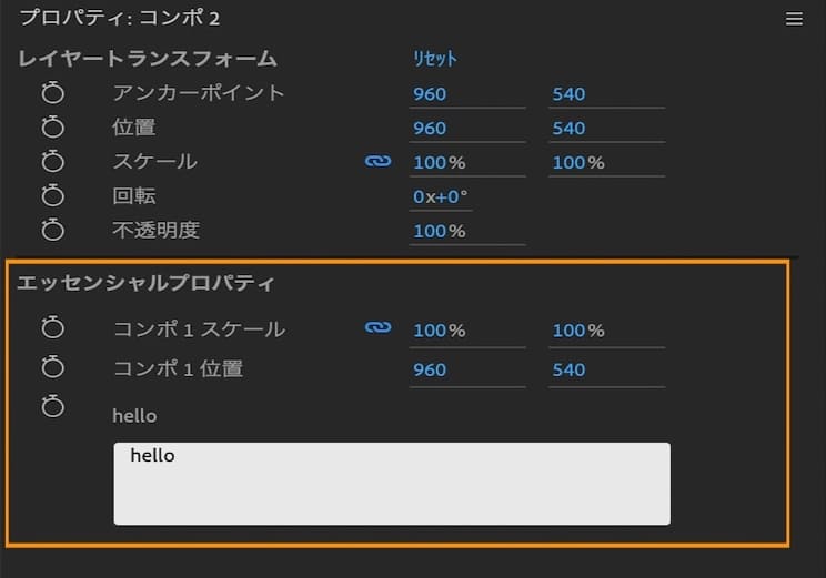 エッセンシャルプロパティがあるレイヤーを選択すると、プロパティパネルを使用して、複数のパネルを開かなくても、エッセンシャルグラフィックスパネルに追加したコンポジションまたはプリコンポジションのエッセンシャルプロパティをすばやく編集できます。