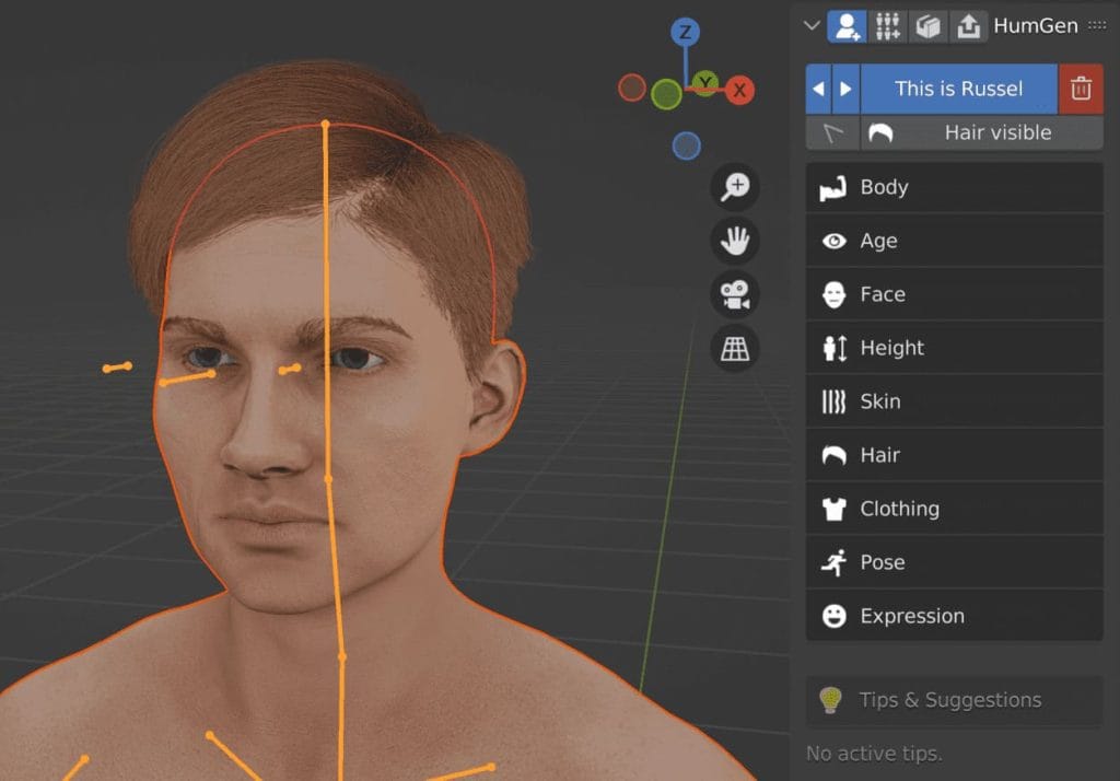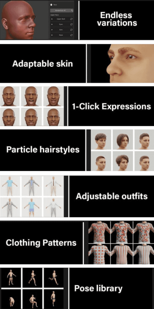 このアドオンでは、体型や服装、ヘアなどがカスタマイズ可能な 3D Human を作成することができます。リグ済みで、1クリックで表情を追加したり、ポーズライブラリーを使用してポージングも可能です。