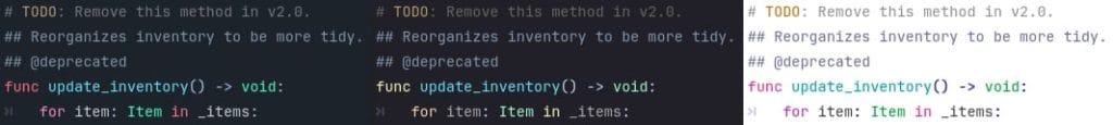 通常のコメントや文書コメントもアップグレードされています。特別なTODOマーカー ( TODO、FIXMEなど) がコードエディターでハイライトされるようになり、より注意を引くようになりました ( GH-79761 )。さらにエディタ設定でキーワードと色を設定できるようになりました。ドキュメントのコメントで、@deprecatedタグと@experimentalタグがサポートされ、生成されるドキュメントでクラスメンバーを適切にマークできるようになりました ( GH-78941 )。ドキュメント生成自体も改善されました ( GH-80745 )。