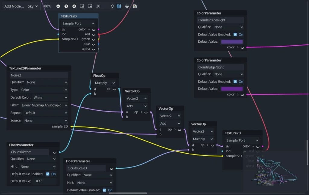 カスタムノードにドロップダウンリストのプロパティが追加され、ビジュアルシェーダが改善されました ( Yuri RubinskyによるGH-81688 )。また、ベクタータイプの出力ポートがデフォルトで拡張可能になりました( Dennis ManaaによるGH-82088) 。