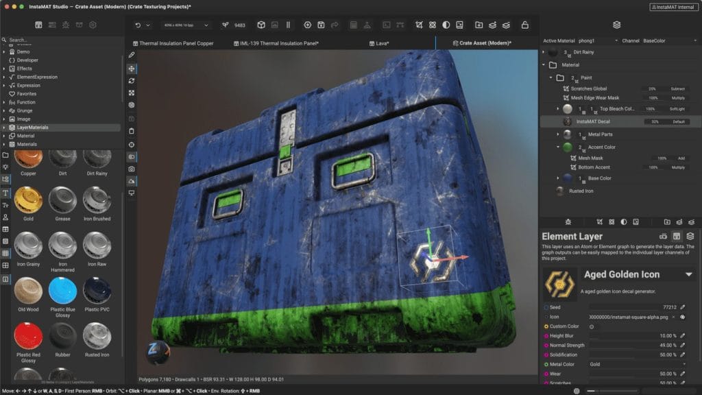 InstaMAT Studio: プロシージャルなマテリアルとアセット作成、スケーラブルなテクスチャリング、データ駆動型のアセットパイプラインのためのツール。多くの機能が搭載され、ノードとマテリアルの豊富なライブラリを備えた InstaMAT Studio は、プロフェッショナルのための包括的なソリューションです。