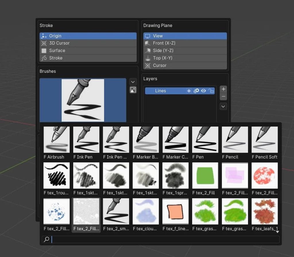 カスタムのグリースペンシルのブラシです。使いやすいポップアップのウィンドウから読み込めます。