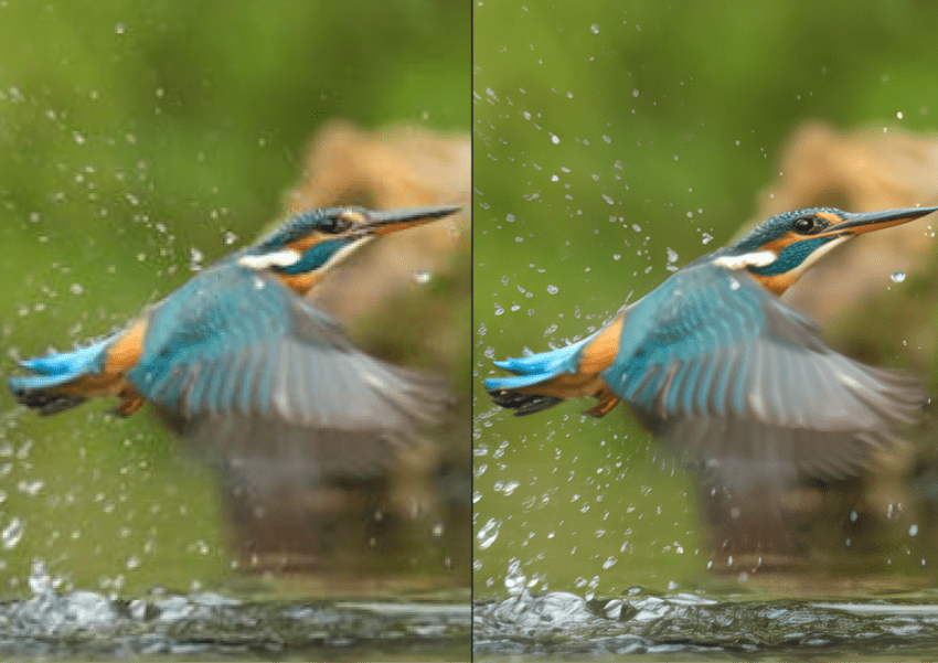 左: 元の入力 610 x 350 ピクセル。右: 6 倍にアップスケール (3660 x 2100 ピクセル)