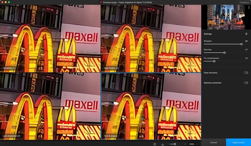 車や 建物のような人工物や定義された形状、さらには複数の言語で書かれたテキストやフォントをアップスケーリングする際に、より明確なパターンや形状を可能にする新しいAIアップスケーリングモデル新しい「Text & Shapes」モデルが追加されました。