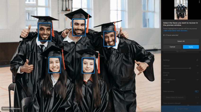 顔選択パネルがGigapixelに追加されました。これにより、検出された顔の数を確認し、どの顔を復元するかを手動で選択できるようになります。顔が誤って検出された場合や、画像内の特定の顔を復元する必要がない場合に便利です。
