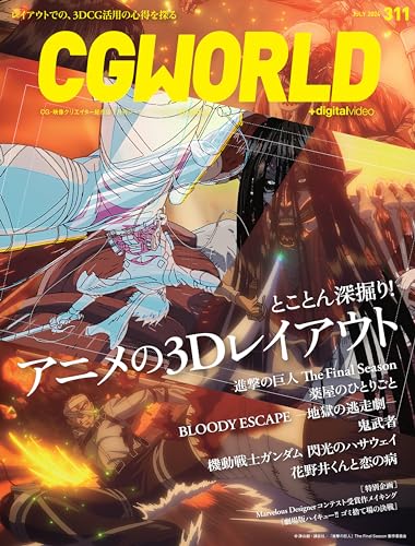 特集のPART 01では『進撃の巨人』The Final Seasonを事例に、MAPPAの3Dレイアウトの仕事を深掘りする。PART 02の事例は『薬屋のひとりごと』。3Dを担当したOLM Digitalと美術監督の高尾克己氏より、キャラクターと背景の正確な対比と、監督の求める画づくりを両立するための工夫を聞いた。PART 03では映画『BLOODYESCAPE-地獄の逃走劇-』を事例に、美術背景と3D背景を的確に使い分けるポリゴン・ピクチュアズの画づくりを紹介。PART 04ではNetflixシリーズ「鬼武者」と映画『機動戦士ガンダム閃光のハサウェイ』をピックアップし、「3Dレイアウト班」を設けているサブリメイションのワークフローを解説する。PART 05で紹介するのは、4月に放送開始した『花野井くんと恋の病』。アニメーション制作のイーストフィッシュスタジオと、美術背景のQuunPlantから、本作における3D背景と3Dレイアウトの活用について聞く。