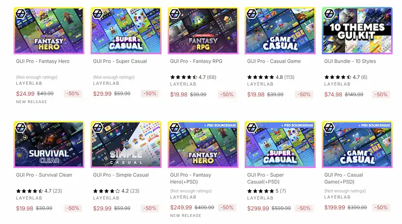 現在のパブリッシャーは、高品質のGUIとゲームアートアセットの制作において10年以上の経験を持つスタジオ LayerLab です。直感的なUXデザインと特徴的なアセットを通して、モバイルゲームのインターフェースから3Dモデルまで、開発プロセスを効率化する高品質なアートリソースを幅広く提供しています。