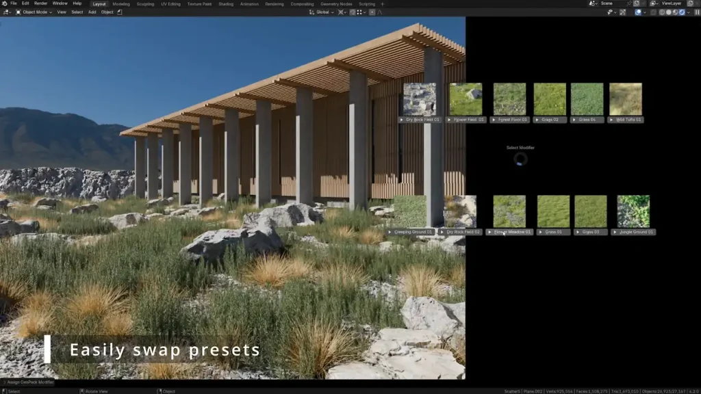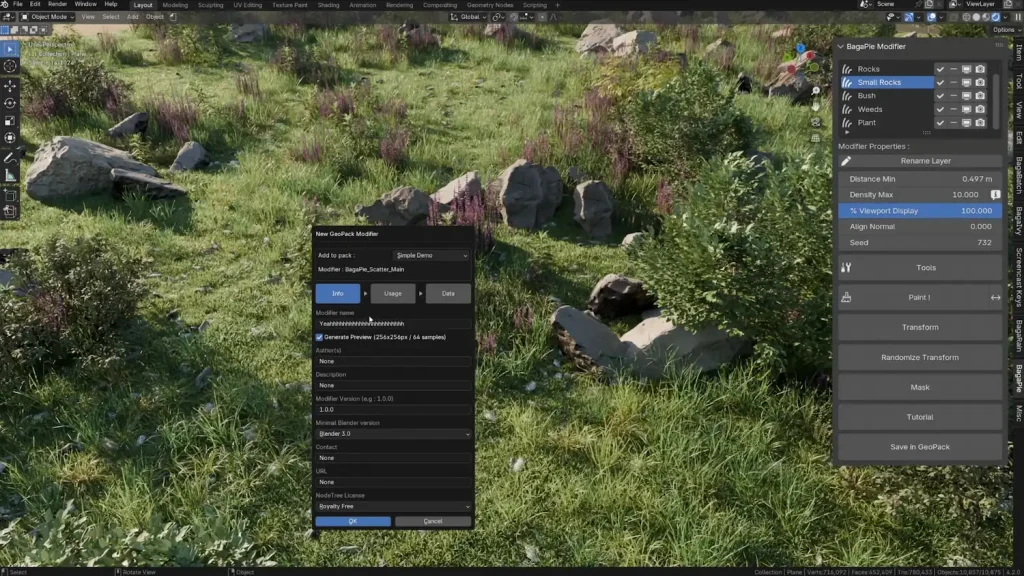 BagaPie Modifierは、建築や環境制作のための50以上のツールを提供する、オールインワンの無料アドオンです。ツタ生成、スキャタリング、パラメトリックオブジェクト、メッシュ編集ツール、グルーピングなどの機能が含まれています。さらに、BagaPieのGeoPack機能を通じて、カスタムツールを作成し共有することも可能です。基本的な機能は以下の記事をご覧ください。