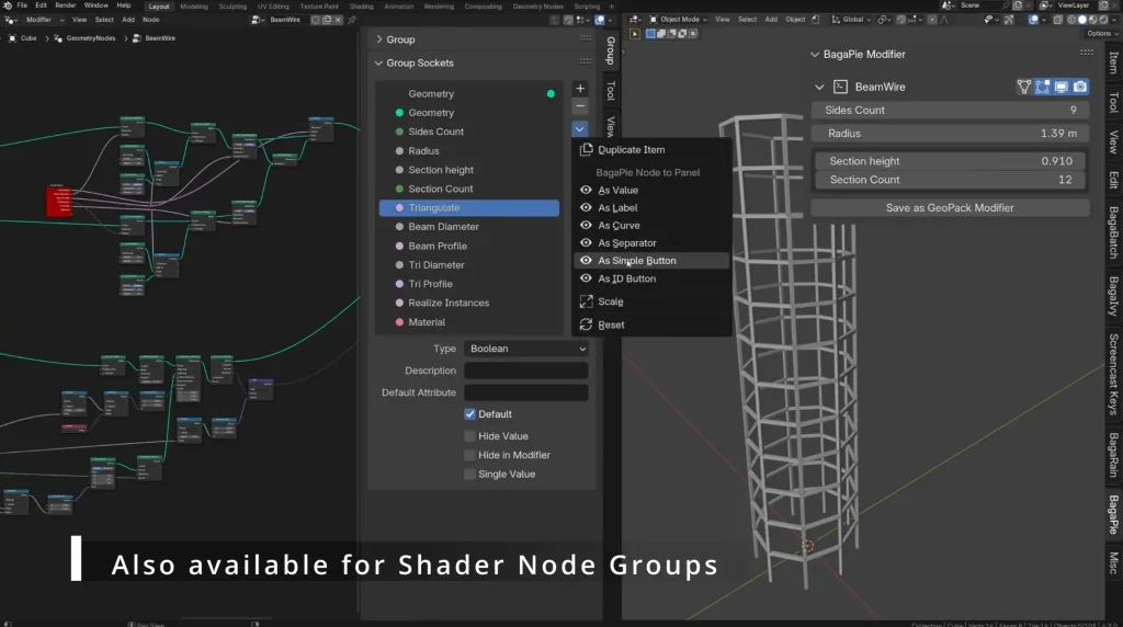- BagaPieパネルに入力を表示: ジオメトリノードやシェーダーノードグループの入力をBagaPieのパネルに直接表示し、操作できます。