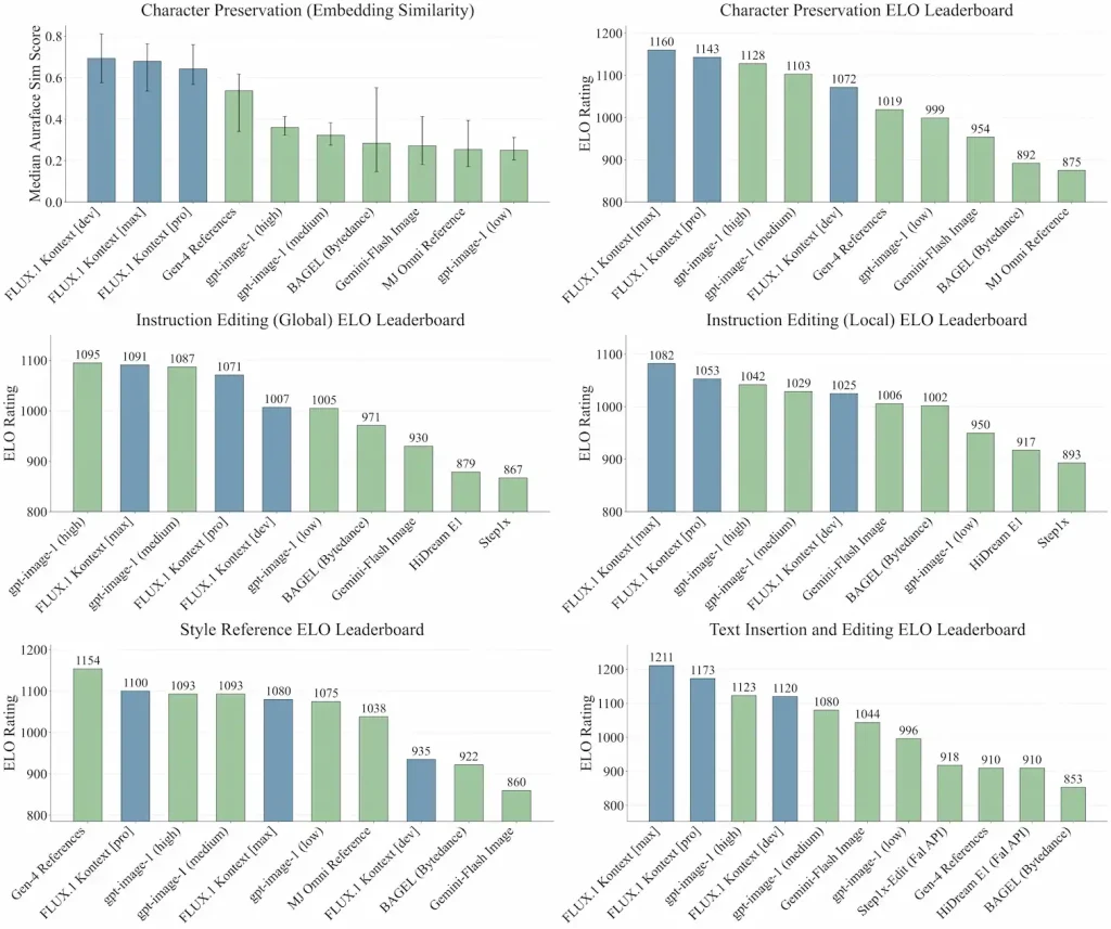 KontextBenchと名付けられた独自のベンチマークを使用し、テキストからの画像生成タスクと画像からの画像生成タスクの両方で高い評価を得ており、特にテキスト編集とキャラクター保存においては最高のスコアを達成しています。また、推論速度においても競合モデルを大幅に上回る結果を示しています。