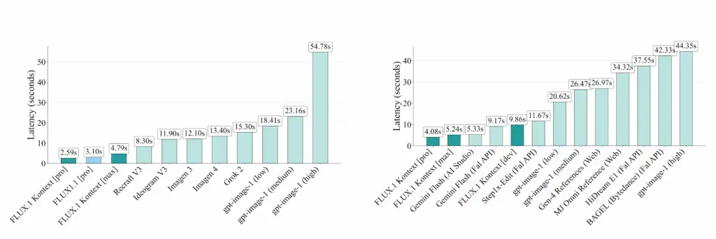 FLUX.1 Kontext モデルは、テキストから画像への生成 (左) と画像編集 (右) の両方において、競合する最先端モデルよりも一貫して低いレイテンシを実現しています。