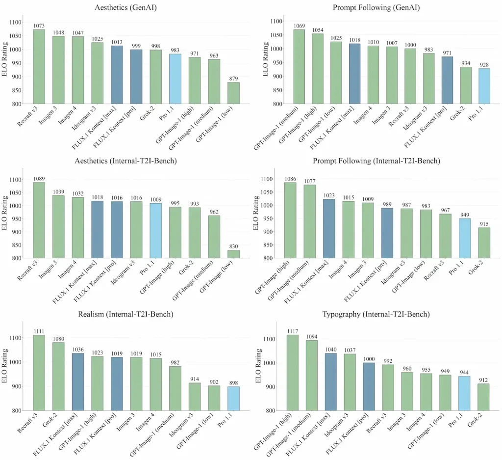 FLUX.1 Kontext を、複数の品質基準におけるテキストから画像への変換ベンチマーク。FLUX.1 Kontext モデルは、美観、プロンプトの追従性、タイポグラフィ、リアリズムのベンチマークにおいて、競争力のあるパフォーマンスを発揮しました。