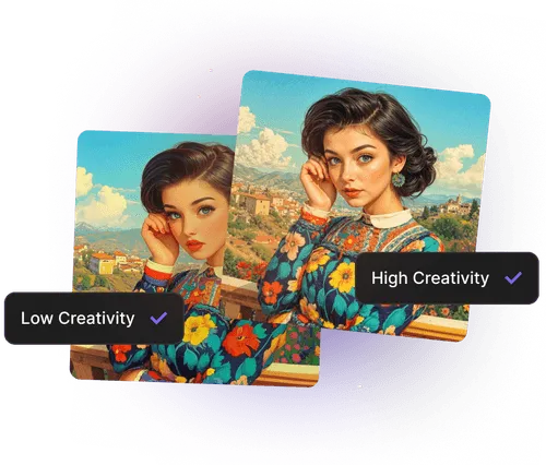 低いクリエイティビティ設定を使用して画像の核を維持しながらディテールを強調したり、高いクリエイティビティで限界を押し広げて驚くような新しいディテールを追加したりできます。