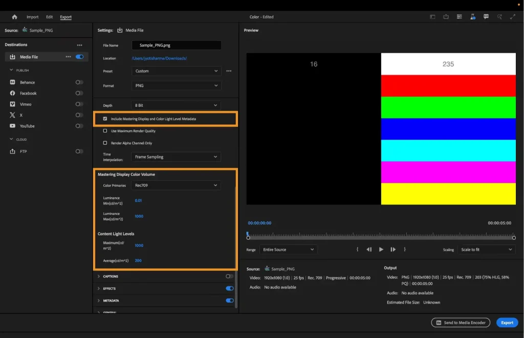 - PNG のメタデータ:オプションで、書き出し設定/ビデオ/詳細の下にあるディスプレイのマスタリングとカラーライトレベルのメタデータを含めるを有効にして、PNG の書き出し中にディスプレイカラーボリュームのマスタリングとコンテンツライトレベルを埋め込みます。