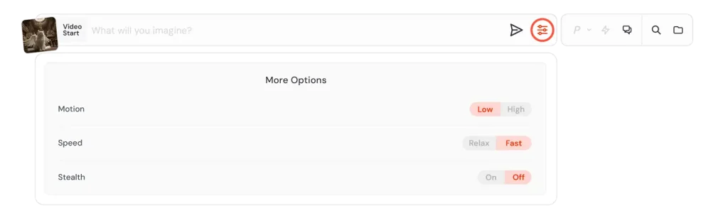 ここでは、デフォルトのモーション設定、GPU速度(Fast/Relaxモード)、ステルスモードを制御できます。これらの設定は、画像生成時の設定と同期しています。