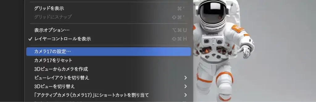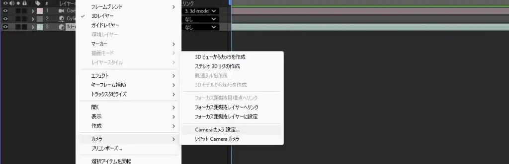 • タイムラインパネルでレイヤーを右クリック/カメラ/デフォルトカメラ設定