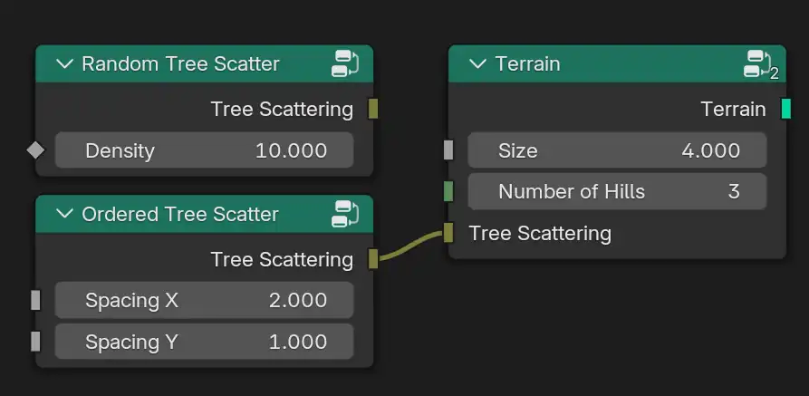 地形ジェネレーターには、異なる木の散布パターンに対応する追加のノードグループを構築することができます。これらは、同じ作成者によって提供されることも、、同じインターフェースを実装した第三者が提供することも可能です。