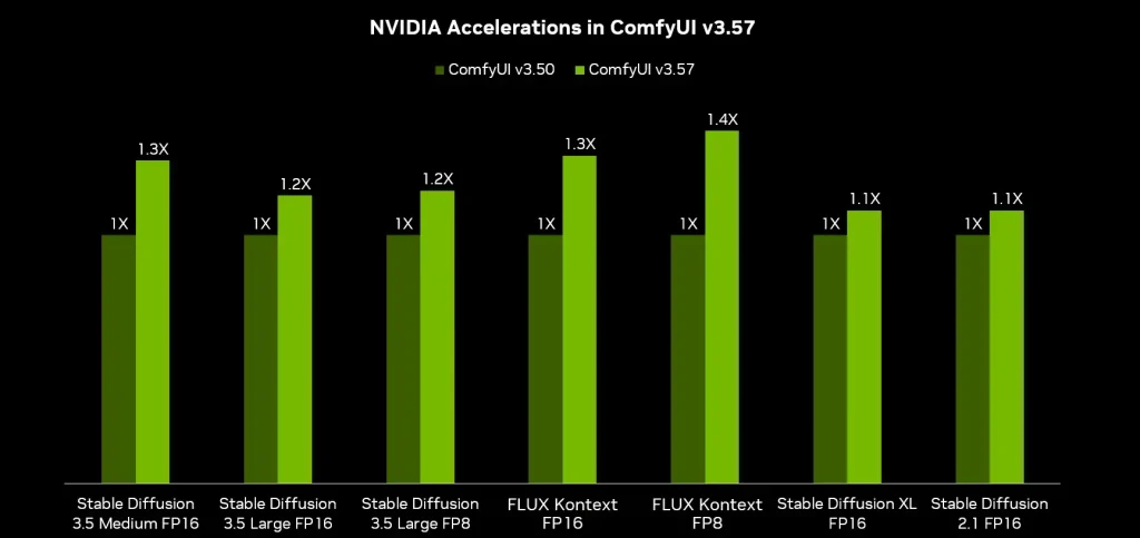 この更新により、NVIDIA RTX GPUでのパフォーマンスが最大40%向上したほか、「Wan 2.2」や「Qwen-Image」、「FLUX.1 Krea [dev]」といった最新のAIモデルがサポートされるようになりました。ComfyUI v3.57 はv3.50と比較して次のようなパフォーマンス向上が見られます。