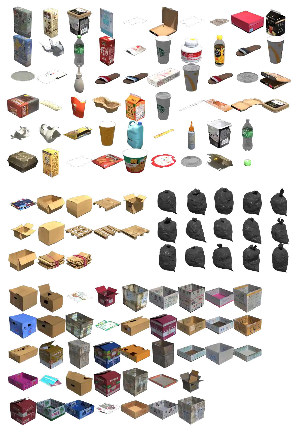 - ボーナスアセット:付属の「ゴミ」モデルは無料のギフトであり、メインアドオンの一部ではありません。適切なUVやトポロジーを持たず、ゲームでの使用を想定していません。これらを理由とした返金の対象にはなりません。