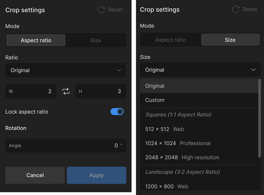 これにより、使い慣れたコントロール、明確なビジュアルガイド、簡単なアスペクト比オプションを備えた、より直感的な切り抜きが可能です。アップスケーリング前に画像を正確にトリミング、傾き補正、または再フレーミングするのに役立ちます。