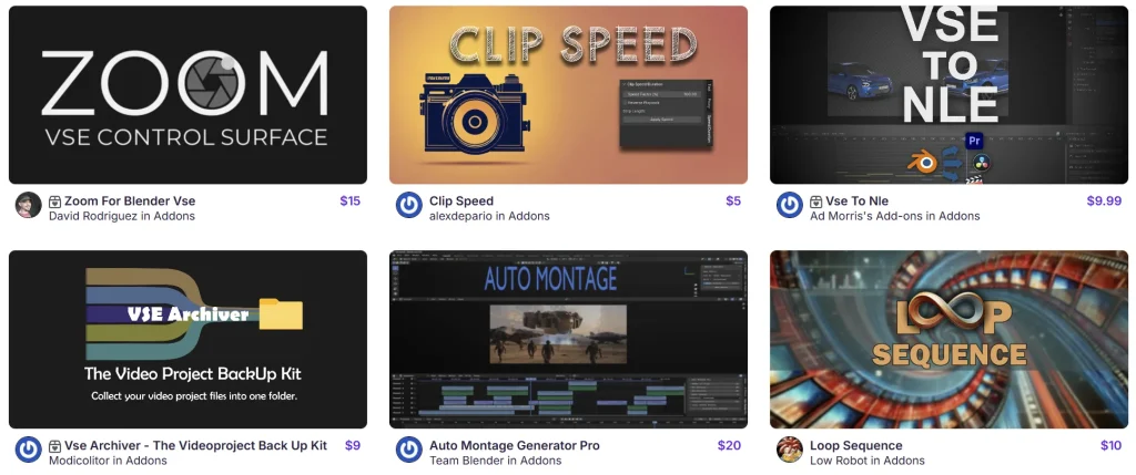 Clip Speed で直感的に速度調整、Zoom for Blender VSE でタブレットを操作サーフェスとして活用可能。VSE to NLE は Blender のタイムラインを Premiere や DaVinci Resolve 形式に書き出せます。さらに VSE Archiver は使用素材をまとめて整理し、共有やバックアップを容易にします。