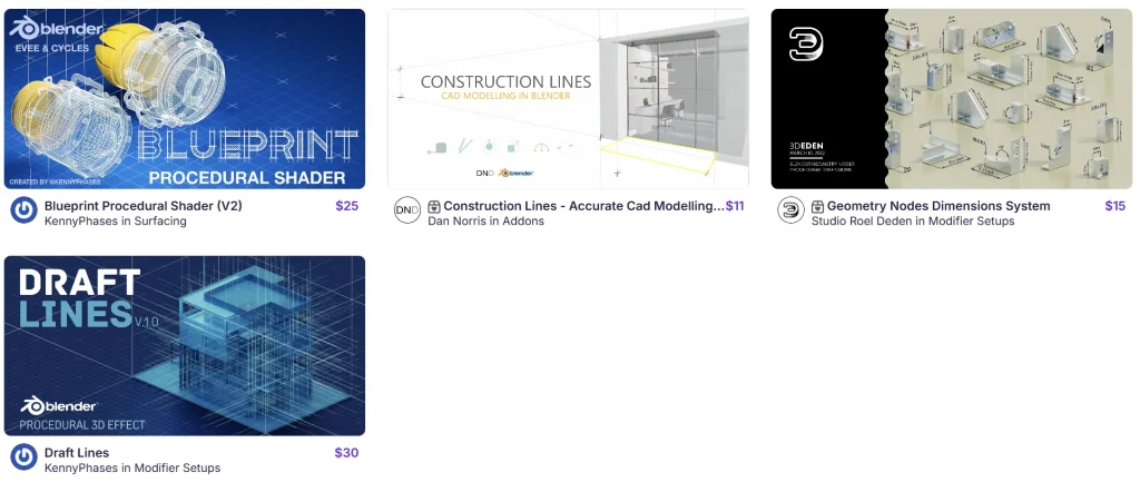 Construction Lines アドオンでCADスタイルの精密モデリングを実現し、Geometry Nodes Dimension System で製造に必要な正確な寸法をモデルに追加できます。さらに Blueprint Procedural Shader を使えば、作品をスタイリッシュなブループリント風に仕上げることも可能です。