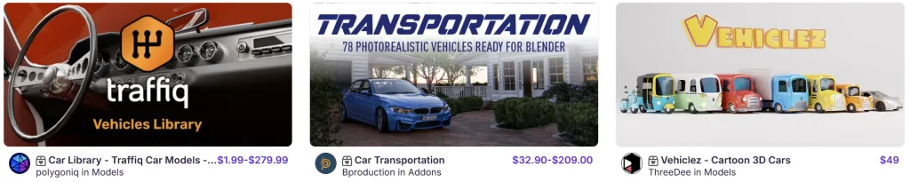 traffiq は高精細な車両と道路標識を含み、Transportation はCycles/Eevee対応のPBRテクスチャ付き。カートゥーン調のシーンには Vehiclez が最適です。フルセットとライト版の2種類が用意されています。