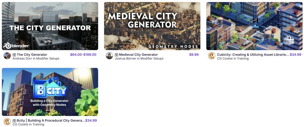 The City Generator(現代都市)と Medieval City Generator(中世都市)で多様な街並みを構築可能。さらに CG Cookie のトレーニングコース Cubicity と Bcity で、自作の都市アセットを作る方法も学べます。