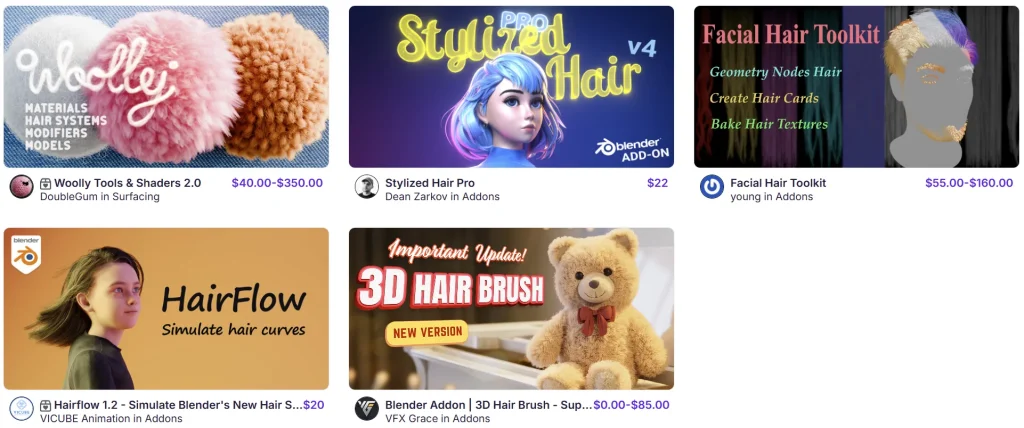 Woolly Tools & Shaders 2.0 で毛皮や髪を追加し、Facial Hair Toolkit でヒゲを作成。Stylized Hair Pro でカートゥーン調の髪型を作り、3D Hair Brush で高度なスタイリング、HairFlow で髪の揺れを物理シミュレートできます。